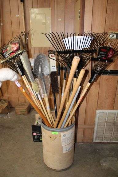 LOT 27 - BARREL WITH 6 RAKES, 4 MOPS, 2 SHOVELS, 2 BROOMS