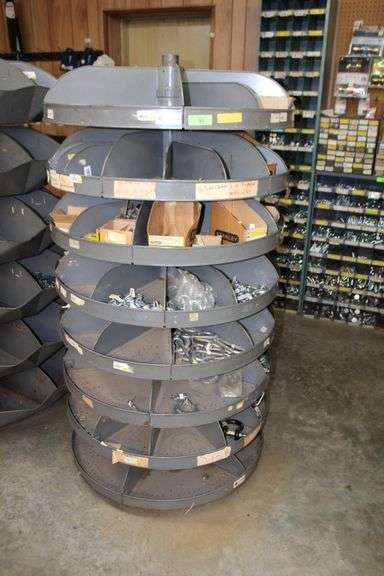 LOT 32 - ROTATING HARDWARE BINS WITH HARDWARE IN BINS