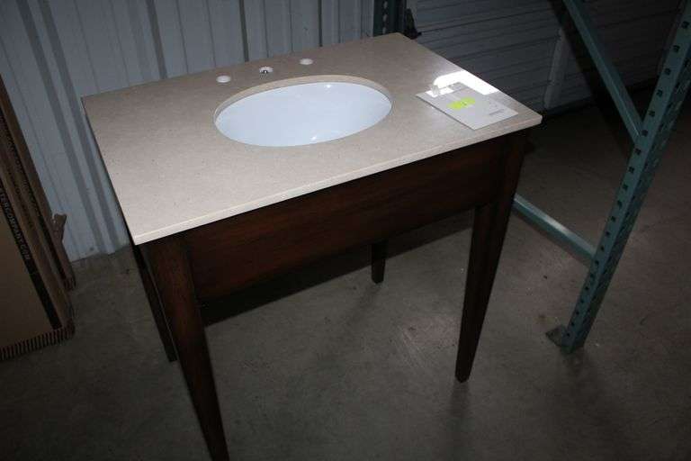 LOT 94-B - VANITY SINK; CHERRY FINISH WITH CREAM MARBLE TOP
