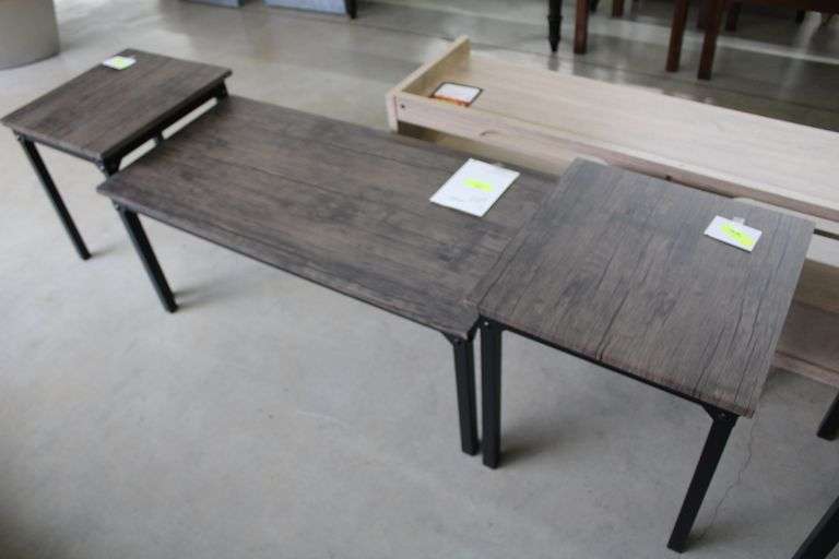 LOT 122-B - LIAM 3-PC SET COFFEE TABLE & 2 END TABLES; BROWN FINISH TOP/ BLACK METAL BASE