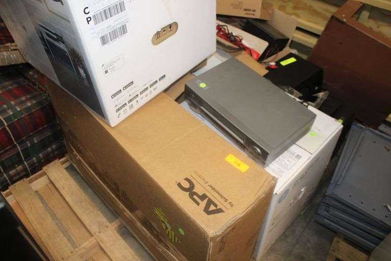 LOT 116 - PALLET OF VARIOUS ELECTRONICS / 32" TV, LCD PRINTERS, SPEAKERS & MORE