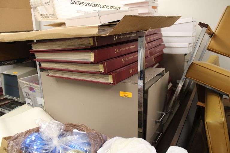 LOT 402 - GROUP OF ITEMS ALONG WALL - 3-METAL DESKS, CABINET, ROLLING CART, ELECTRONICS, 10-WOOD TOTES, 4-GREE