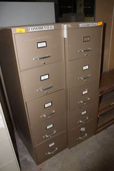 LOT 562 - 2- FIVE DRAWER METAL FILE CABINETS & 1- WIDE METAL TWO-DRAWER CABINET